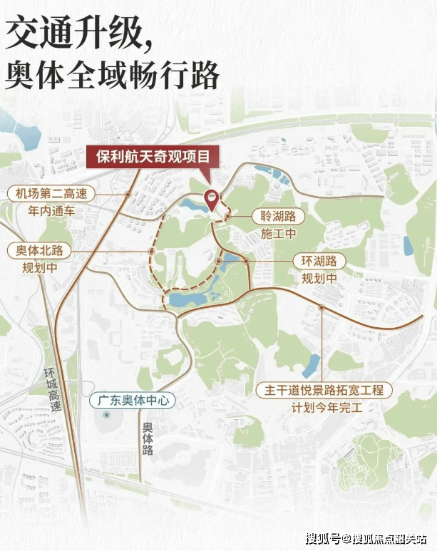 将视线拉远,保利辰园湖境所处的位置,正是广州“东进”战略中备受关注的天河智谷片区。这里北接科学城,南望金融城,直线公里。虽然项目距离最近的地铁21号线分钟左右,日常通勤更多依赖自驾或社区接驳,但周边的路网正在经历一轮显著的升级。随着悦景路拓宽工程即将完工,未来联通奥体路后可直上机场第二高速;规划中的聆湖路一旦建成,将直接连接大观街与大观中路主干道,大幅提升前往智慧城片区的效率。依托全运会带来的基建红利,总投资680亿元的道路项目建设正在打通区域的“六横七纵”,让这片曾经略显安静的土地,逐渐显露出作为城市CTD(中央科技区)的交通骨架。